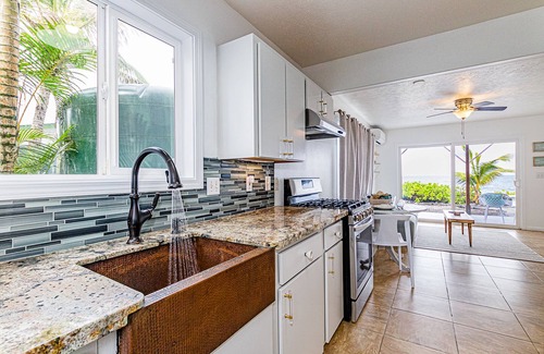 For a complete oceanfront dining experience, pull up a chair on the lanai dining table or gather around the outdoor seating area. Allow the Hawaiian sea breeze to accompany your views of the beautiful lava rock cliffs and black sands of your paradise retreat.