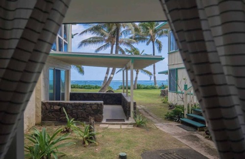 Ocean Front Right on the Beach! The Beach is protected by a reef a ways out so it's perfect for snorkeling without the bigger waves. Beaches with big waves are nearby! Shrimp Truck, Thai Food Truck, Burger Food Truck, Vietnamese Pho Food Truck, Hawaiian Ice stand and convenience store with local food counter half block away across the street! Less than 5 miles to the Polynesian Cultural Center, Hawaii’s #1 paid attraction, draws millions of visitors annually with their world-class entertainment, learning, shows, and luaus. There is a Longs drugstore and two grocery stores in the area. Five minutes away, Laie Beach Park has great year round larger waves for body surfing. Turtle Bay Resort Golf Courses/Restaurants and World Famous North Shore Surfing Beaches a short drive away. If it's winter, along the North Shore you'll be treated to 30 to 40-foot tall waves and some of the world's best surfers. You'll also find Waimea Bay and the beautiful Waimea Falls Park with its sacred sites, waterfall and wonderful hula dancers. Or drive a few more miles to the quaint town of Haleiwa and its many art galleries, boutiques and restaurants. There is also horseback riding nearby and of course, the beach and the ocean - right outside your door!