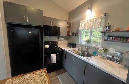Hale Malie is a 1-bedroom, 1-bathroom private cottage that can comfortably accommodate 1-2 guests. Our interior finishes are excellent quality, with dual paned windows, and luxury vinyl plank flooring throughout. Queen size mattress, large bathroom with laundry facilities, living room and kitchen/dining area. The cottage is 500 sq. feet, providing a cozy and intimate experience for guests. As your host, we offer free, fast, and reliable internet as well as a TV in the bedroom equipped with an Amazon Fire Stick for your entertainment, though we suspect you'll want to spend most of your down time sipping a cup of coffee or enjoying a glass of wine on our spacious covered lanai to enjoy the beauty and sounds of nature.