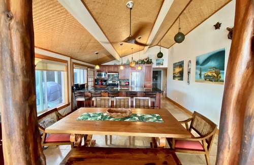 Inside, the two-story open floor plan is filled with island character—stone floors, cherry cabinetry, vaulted ceilings, Ohia logs, and eclectic surf art. The fully stocked kitchen opens to spacious dining and living areas with ocean views, while three of the bedrooms (plus the futon area - open space at top of stairs between the 2 bedrooms) are oceanfront. Every bedroom and family room is equipped with Smart TVs and WiFi throughout, so you’ll enjoy both comfort and convenience.