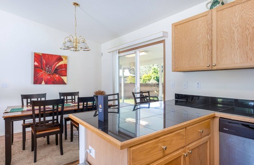 Start vacation days with a morning beverage of choice and admire the lush landscape while relaxing on the lanai. The outdoor dining table invites meals alfresco and the partially enclosed lawn is perfect for fun yard games.